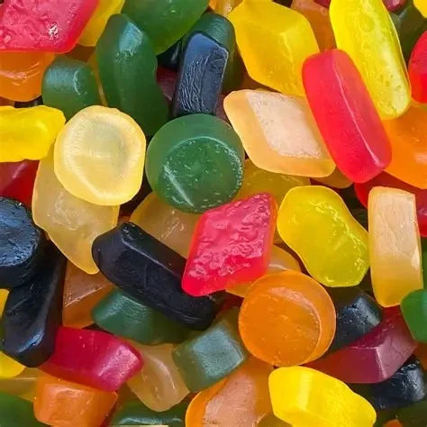 Sirop deglucose, sucre, eau, amidon deBLE, gélatine de porc, amidonmodifié, acidifiant (E270),arômes (groseille à maquereau,fraise, orange, poire, cassis,citron), colorants (E100, E120,E141, E153, E160c), huilesvégétales (coco, palmiste),agents d'enrobage (E901,E903).
